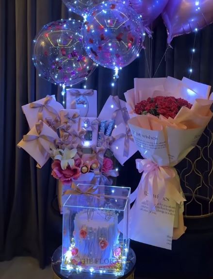 • Designer Cake in Acrylic Box 🍰 (with LED fairy lights around it, decorated with pink flowers)