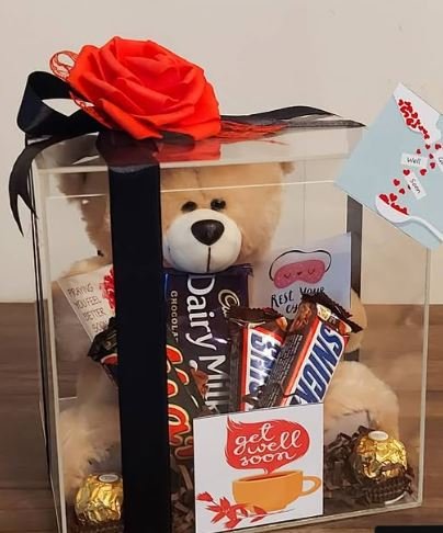 A soft teddy bear 🧸 placed inside a clear acrylic box