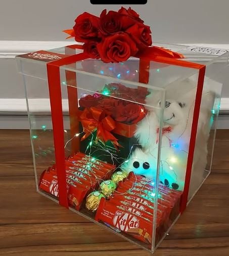 • A transparent acrylic gift box decorated with red ribbon and bow 🎀