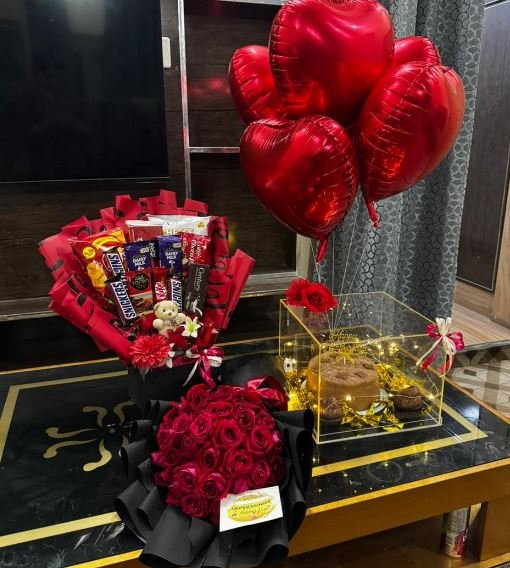 Overall, it looks like a Valentine’s or romantic gift arrangement combining chocolates, flowers, balloons, and a cake. 💝